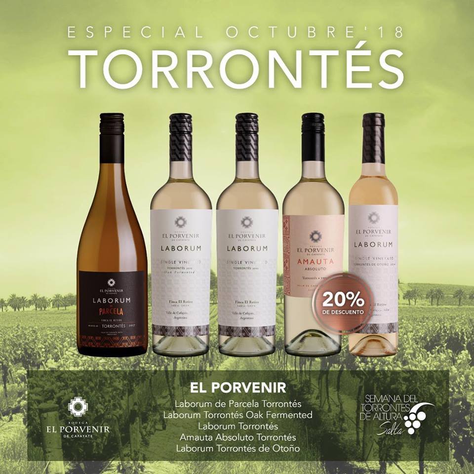 Durante el mes de octubre, Bodega El Porvenir de Cafayate propone disfrutar de cualquier Torrontés de la bodega con un 20% de descuento. Esta promoción estará vigente hasta el 31 de octubre o hasta agotar stock. Los vinos que participan son: Laborum de Parcela Torrontés, Laborum Torrontés Oak Fermented, Laborum Torrontés, Amauta Absoluto Torrontés y Laborum Torrontés de Otoño.