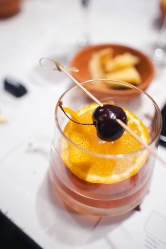 Refrescado en vaso de composición. Servir en vaso old fashioned con una esfera de hielo. Decorar con un twist de Naranja, rodaja De Naranja y cereza.