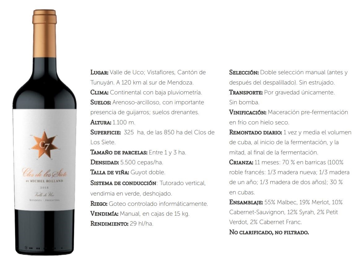 «Clos de los Siete 2018 presenta un profundo color rojo de atractivos destellos rubí. Sus aromas revelan frutos negros, moras y arándanos, y notas florales con un leve toque especiado. El ataque en boca es goloso, envolvente y amplio. Este assemblage sorprende por el gran balance de taninos, firmes y redondos, una fruta intensa y una buena tensión ácida que le otorgan frescura y una larga persistencia en boca. Un gran vino para coleccionar, complejo, elegante y seductor.» expresa Michel Rolland a la hora de presentar esta nueva cosecha.