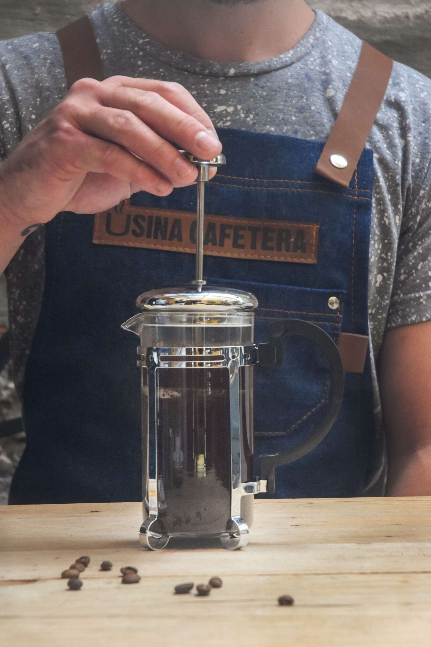 Una vez que la jarra está caliente y los granos molidos en el tamaño correcto agregarlos a la prensa, verter el agua, remover un poco para que el café se mezcle perfectamente con el agua para extraer el sabor y los aceites esenciales de los granos. Estos aceites ayudarán a crear el sabor adecuado en la taza. Luego de esperar entre 4 a 5 minutos, comenzar a presionar lentamente el pistón o émbolo hacia abajo, que es el mecanismo que filtrará la infusión. Este proceso debe hacerse lenta y constantemente para lograr una filtración perfecta.